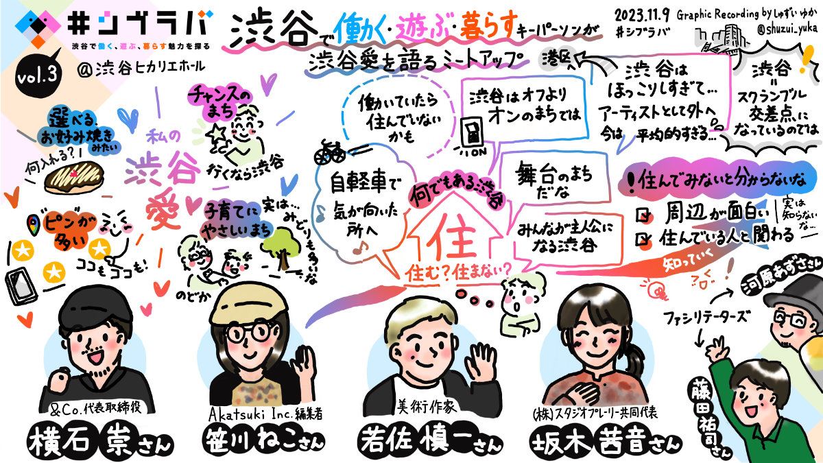 グラフィックレコーダーの守隨佑果(しゅずい・ゆか)さんによるグラフィックボード。「渋谷は住む場所ではない!」と思われがちですが、住人からすれば「意外にほっこり」するシーンも多いとか。渋谷に住んでいる人達とコミュニケーションを取るなど、ローカルと積極的に関わることで、「暮らしの舞台」としての渋谷の魅力をより深く理解することができるのかもしれません。
